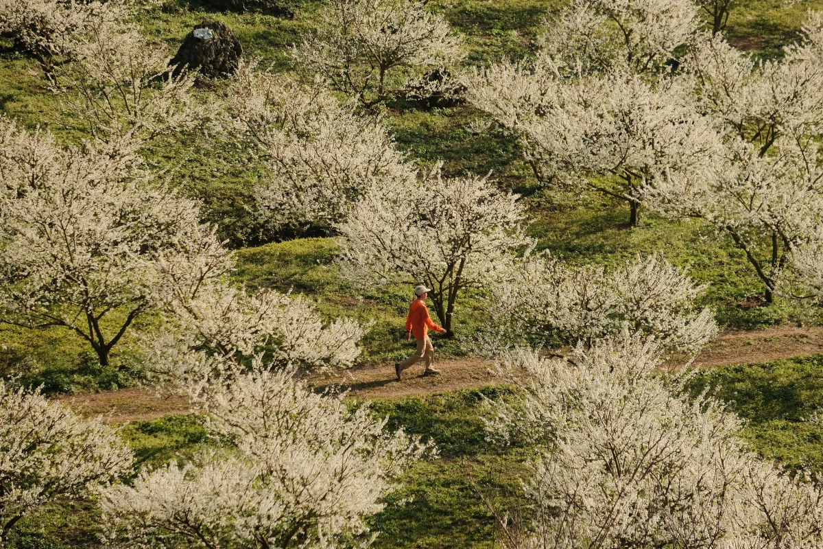 Năm nay đông du khách nhưng diện tích rừng mận rộng nên chỉ cần đi sâu thêm vài phút là sẽ có ngay góc riêng không vướng người. Thậm chí nhiều vườn còn giữ nguyên địa hình tự nhiên, có cả lối đi đất, thân cây cũ, mảng đá xếp tự nhiên rất hợp pose kiểu vintage. Ai thích ảnh “ngồi bệt giữa cỏ” hoặc “dựa cây chill chill” thì đảm bảo hết nước chấm.